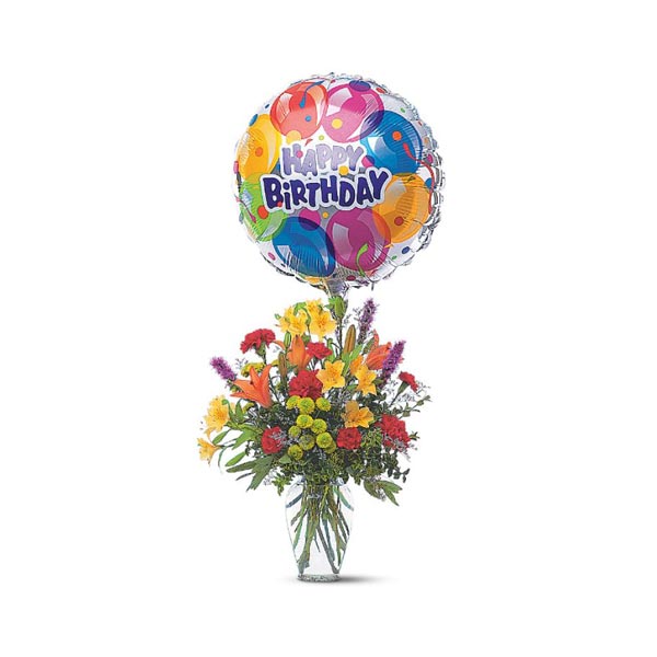 Prenez un autre anniversaire à la marque de nouveaux sommets avec cet arrangement de fleurs colorées et un ballon d'anniversaire volant à haute altitude .