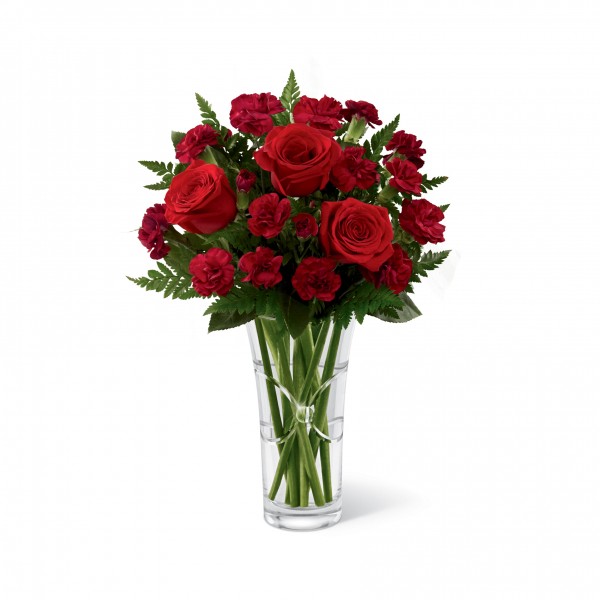 Le bouquet des amoureux fleurit avec des roses et des oeillets miniatures pour vous aider à célébrer cette venue de Saint-Valentin! Roses rouges brillants sont réunis avec des mini-oeillets bordeaux et de la belle verdure pour former un arrangement de fleurs exquis pour cette personne spécial. Présenté dans un vase en verre clair. Ce bouquet ne se fera pas oublié de si tôt.