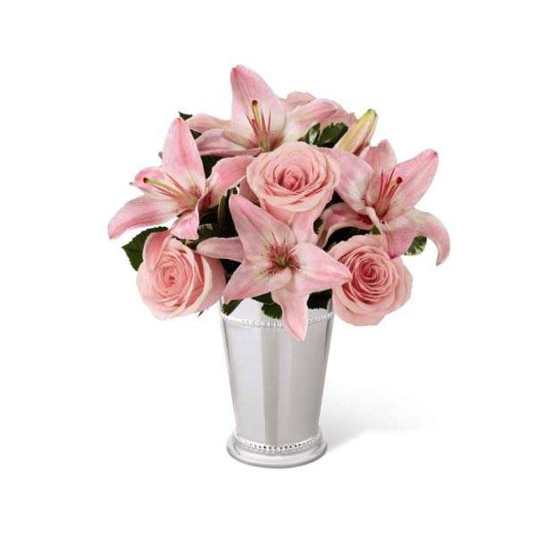 Les roses aux pêches s'asseyent parmi les petites roses blanches dans un beau vase verre clair de dessinateur qui vante les beaux accents coupé à la main et créer un bouquet merveilleux exsudant le charme et l'élégance.