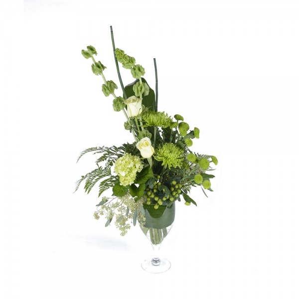 Si vous recherchez un arrangement qui sort de l'ordinaire, cet arrangement est pour vous. Composé de mollucela, de pinnochio, de fudji, de roses, d'hydrangea et d'hypericum, ce bouquet est rempli de fraicheur